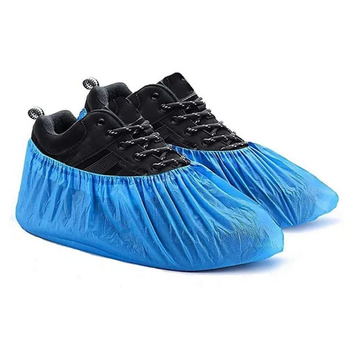 CPE Shoe Covers in Blue, made from durable Chlorinated Polyethylene (CPE) material. These protective covers provide effective protection against liquid contamination, dirt, and debris. Waterproof and resistant to chemicals, oils, and greases, they are ideal for healthcare, food processing, and manufacturing industries. Designed to be slip-resistant, with an elastic opening for a snug fit, they prevent contaminants from entering. These disposable, single-use covers ensure hygiene, are comfortable and breathable for extended use, and come in one size that fits all.
