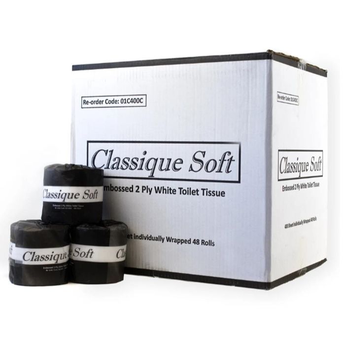 Classique Soft Embossed 2 Ply White Toilet Tissue offers a gentle and comfortable feel with every use, thanks to its soft embossed texture and quality 2-ply construction. Each roll contains 400 sheets, providing great value and long-lasting use, making it ideal for homes, offices, and commercial washrooms. Supplied in a convenient carton of 48 rolls, it’s a practical and reliable choice for maintaining hygiene and comfort in high-traffic areas.