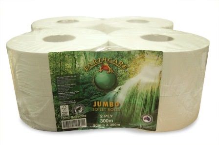 Earthcare's eco-friendly 2ply 300 metre jumbo toilet rolls deliver superior environmental benefits (made from 100% post-consumer waste), excellent softness, strength and absorbency, and great local benefits for Australia.
