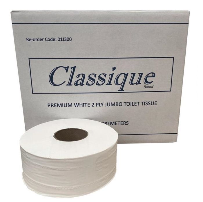 Ensure long-lasting quality and comfort with Classique Premium White 2 Ply Jumbo Toilet Tissue. Each carton includes 8 jumbo rolls, each measuring 300 meters in length. Designed for high-traffic areas, this premium toilet tissue provides exceptional softness and strength, ensuring a gentle and effective clean. Ideal for commercial settings, Classique jumbo rolls reduce the need for frequent replacements, offering both convenience and value. Enjoy reliable performance with Classique Premium Jumbo Toilet Tissue.