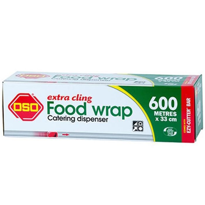 Oso Extra Cling Wrap, measuring 33cm, the ideal high-quality cling wrap for commercial kitchen applications. Perfect for use with stainless steel trays and bowls, it allows contents to breathe and helps meats retain their natural colour. This cling wrap is suitable for a variety of fresh produce, including meat, poultry, and fruit. It includes an easy-to-use Safe-T-Cutter, ensuring convenience and safety in every use.