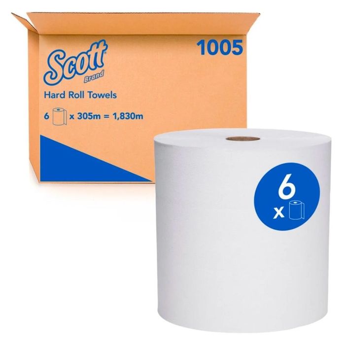 Elevate your workplace experience with trusted and familiar SCOTT® solutions, designed to support compliance and control.For busy work environments and high traffic washrooms, choose SCOTT® Hard Roll Towels. Measuring 305m in length, the paper towel roll provides a high capacity hand towel system for your workplace, minimising maintenance time and reducing the risk of run outs. Each SCOTT® Hard Roll Towel fits into a choice of a mechanical or touchless dispenser, both of which automatically control the length of paper towel dispensed. This hand towel dispensing method reduces waste and cost while also enabling a hygienic hand drying experience, ideal for use within hospitality, education and food manufacturing.Every roll of this white SCOTT® Hard Roll Towel is manufactured with AIRFLEX® technology, ensuring high quality absorbency and a superior hand drying performance with every use. Made using 70% recycled materials and FSC® certified, SCOTT® Hard Roll Towels are also HACCP International certified for food safety reassurance.Each case contains 6 rolls and each roll contains 305m of white paper towel.SCOTT® Hard Roll Towels are compatible with the SCOTT® Hard Roll Towel dispensers in white (7377) and black (7378).SCOTT® Hard Roll Towels by KIMBERLY-CLARK PROFESSIONAL®, form part of a wider range of washroom products designed to create a safer, healthier and more productive workplace.