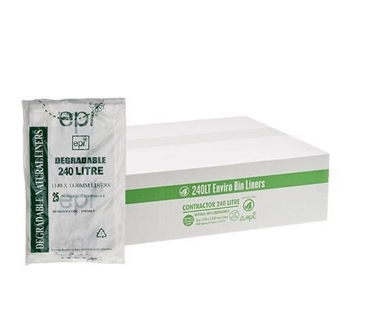 Envirogreen 240LT Bin Liners are clear, degradable garbage bags made from high-quality virgin HDPE. These 240L liners use EPI technology to break down in landfill, providing an environmentally friendly waste management solution. The liners come in easy-to-read inner and outer cartons and are packaged for easy dispensing. Each carton contains 4 packs of 25 liners, sized 1420mm x 1140mm. Available in multiple sizes to meet various needs.