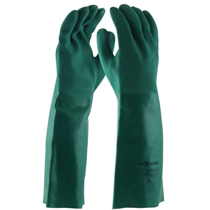 Men's Green PVC Gloves, designed for exceptional performance in demanding environments. These 18" (45cm) gloves offer a nonslip grip in both wet and dry conditions, along with maximum resistance to mild chemicals and solvents. The sandy finish on the palm enhances grip in oily and greasy conditions, ensuring secure handling. Jersey lining provides comfort, while the gloves boast excellent abrasion, oil, and wear resistance for durability. Suitable for a variety of applications including refining, petrochemical industries, fishing, mining, construction, and waste management, these gloves are available in one size fits all.