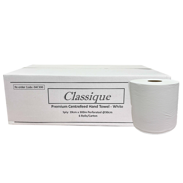 Classique Centrefeed Hand Towel White 300m is a high-capacity, absorbent paper towel ideal for both hand drying and general surface cleaning in busy commercial, industrial and hospitality environments. The strong 1-ply design provides reliable performance while remaining economical, and the perforations at every 30cm ensure easy tear-off and reduced waste. Each roll measures 19cm x 300m, offering excellent value with fewer roll changes required, and is supplied in cartons of 6 rolls for convenience in storage and distribution.