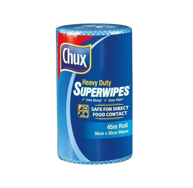 Say goodbye to stubborn grease and grime with the impressive force of the Chux Heavy-Duty Superwipes! Extra strong, extra thick and 20% more absorbent when compared to the Chux Original Superwipes. Each cloth has a thicker and heavier weave that was built to handle the big clean-up jobs, and features a super fast-drying make ideal for repeated use, and a perforated edge for a convenient tear-off which makes dispensing a breeze, so you can put the hurt on dirt! On top of that, the Chux Heavy Duty Superwipes are FZP HACCP Approved for direct food contact (Food Zone Primary) and their strongest and most absorbent range of cloths. 56cm x 30cm x 45m.