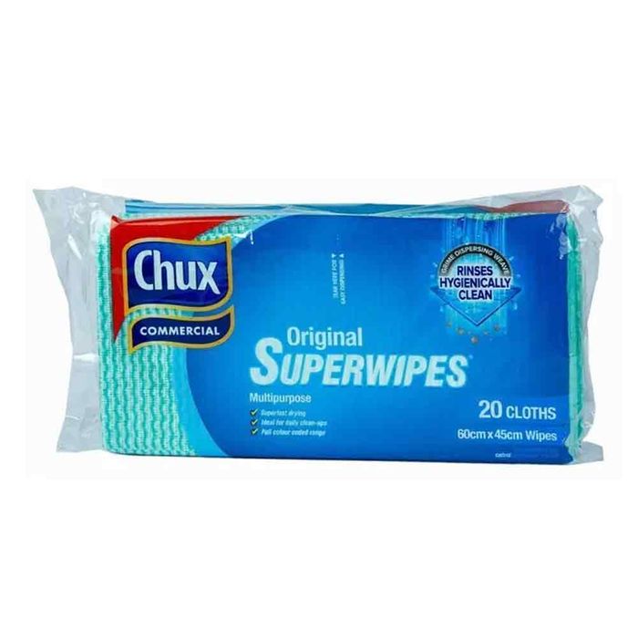 Any cloth can clean, but there has to be a reason why our Chux Original Superwipes have been a tried and tested Aussie favourite for 50 years. Specially designed with a grime dispersing weave, these super-fast drying, and highly absorbent cloths feature special double action holes to easily pick up dirt and food particles. The result is a quality cloth that gets the job done the first time, every time. Packed in ready-to-use 60 x 45 cut sheets for convenience, the Chux Original Superwipes are colour coded green for use in any low-risk, general area.