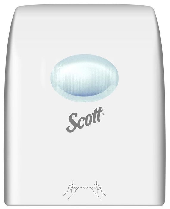 SCOTT® Hard Roll Dispenser features a controlled dispensing system that measures the length of towel helping to prevent waste and overuse. And touch-free dispensing enables the user to retrieve the towel without touching the dispenser, helping to promote good hygiene in the workplace.Certified by HACCP International and compatible with both white and blue SCOTT® Hard roll towel up to 305m in length (1005, 6668) this dispenser is a high capacity dispensing solution for busy workplaces. Featuring a contemporary design in white, high-gloss ABS plastic, with smooth and continuous surfaces making it easy to clean whilst also blending seamlessly into your workplace. This commercial dispenser features a viewing window that enables you to check towel levels before refilling for more efficient washroom maintenance and is lockable to deter pilferage.Measuring 307 x 382 x 243mm, this dispenser is compatible with both KLEENEX® Hard roll towel in white (6765) and SCOTT® Hard roll towel in both white (1005) and blue (6668).SCOTT® Hard Roll Dispensers by KIMBERLY-CLARK PROFESSIONAL®, form part of a wider range of cleaning products designed to create a safer, healthier and more productive workplace. productive work environments.