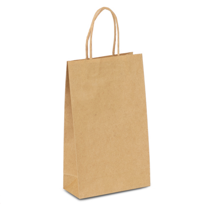 The Brown Paper Carry Bag Baby with Paper Twist Handles is a compact and eco-friendly packaging solution, ideal for small retail items, gifts, or takeaway goods. Made from durable kraft paper, it features sturdy twisted paper handles for easy carrying and a natural, rustic look. Fully recyclable and biodegradable, it's a sustainable alternative to plastic bags. Supplied in a carton of 250, this bag is perfect for boutiques, cafés, gift shops, and events looking for reliable and environmentally conscious packaging.