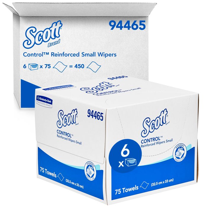 Elevate your washroom experience with trusted and familiar SCOTT® washroom solutions, designed to support compliance and control.SCOTT® Control Reinforced Small Wipers are made with 4-plys with an additional reinforced layer for extra strength. These multipurpose wipers are suited to hand drying as well as for use in general surface cleaning and wiping tasks. The wipers can be dispensed directly from the carton or for a more premium presentation, they are also compatible with Clear acrylic wiper dispenser (94040)A case of Reinforced Small Wipers contains 6 cartons of wipers, each carton contains 75 wipers. The SCOTT® Control Reinforced Large Wipers (94466) and SCOTT® Control Reinforced Small Wipers Bulk pack (94467) are part of the SCOTT® Control family.SCOTT® Control Reinforced Small Wipers, by KIMBERLY-CLARK PROFESSIONAL®, form part of a wider range of products designed to create a safer, healthier and more productive workplace.Always read the label.Follow the instructions for use.