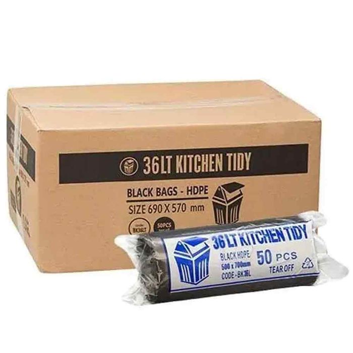 The 36L Kitchen Tidy Liner HDPE in Black, meticulously crafted from high-quality virgin HDPE, ideal for office or kitchen waste bins. These liners come in convenient tear-off rolls, ensuring effortless use and storage. Each liner measures 700mm x 580mm, providing generous coverage for your waste bins. Packaged in easily identifiable inner and outer cartons, our liners offer hassle-free storage and handling. Each carton contains 20 rolls, with 50 liners per roll, providing ample supply for your needs. Choose the black HDPE option for a sleek and practical solution to your waste disposal needs. 50 liners per roll.