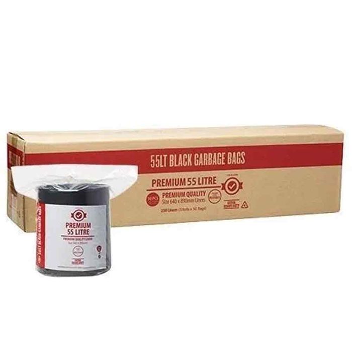 The 55L Premium EHD Bin Liner in Black is made from high-quality LDPE, offering extra strength and durability for heavier loads. These tear-resistant bin liners are designed for demanding tasks, ensuring reliability in various settings. Each liner measures 830mm x 630mm and is made from 100% recycled materials, contributing to eco-friendly waste management. The liners are conveniently packaged on tear-off rolls, with 5 rolls of 50 bags per carton, making them easy to dispense and store. Perfect for heavy-duty use, these liners provide exceptional durability and strength.
