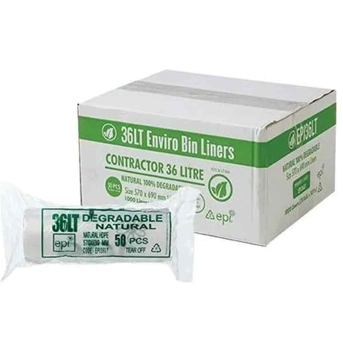 The Degradable 36L Bin Liners Clear are crafted from high-quality virgin HDPE and incorporate EPI technology for degradation in landfill environments, making them an eco-friendly choice for large office and kitchen waste bins. These natural HDPE liners come in a convenient tear-off roll design, with each carton containing 1000 liners, divided into 20 rolls of 50. Measuring 700mm x 590mm, they offer ample capacity and are available in multiple sizes to meet various waste disposal needs. All packaging is clearly labelled for easy identification.