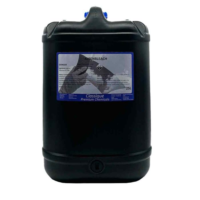 Kleenbleach 25L is a strong, multi-purpose liquid bleach ideal for sanitising surfaces, whitening fabrics, and removing stubborn stains. Suitable for both domestic and commercial use, it provides effective results on kitchens, bathrooms, laundry, and more. For best performance, apply to the desired area, leave for 10 minutes, then rinse thoroughly with water. Always spot test first to ensure material compatibility.