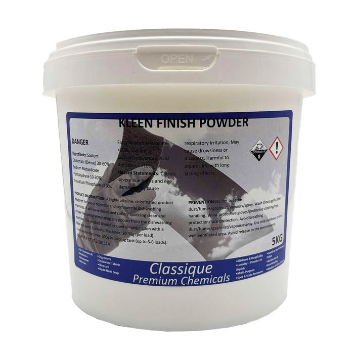 Kleen Finish Powder 5kg is a professional-grade dishwasher detergent formulated to deliver powerful cleaning performance in both commercial and domestic dishwashing machines. Its concentrated formula effectively cuts through grease, food residues, and stains, ensuring dishes, glassware, and utensils come out sparkling clean. Suitable for use in hard and soft water areas, this powder helps prevent limescale build-up and maintains optimal machine performance. The 5kg bulk packaging offers excellent value, making it ideal for high-usage environments such as restaurants, cafés, and catering services.