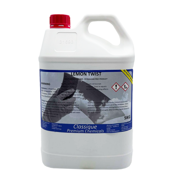 Lemon Twist 5L Hand Cleaner is a heavy-duty, citrus-based hand cleanser designed to effectively remove oil, grease, dirt, and other ground-in soils. Formulated with natural lemon oils and detergents, it contains fine abrasive particles that provide a thorough yet gentle clean without damaging the skin. The inclusion of lanolin derivatives and antiseptic agents helps to prevent chapping and supports skin health, making it ideal for use in industrial settings such as garages, workshops, and engineering environments. Supplied in a convenient 5-litre bottle, it offers excellent value for high-usage areas.