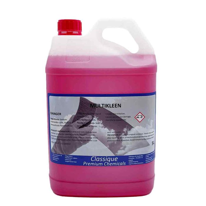 Multikleen 5L Multi-Purpose Cleaner is a non-caustic, versatile cleaning solution designed to tackle normal grease and oil on a variety of surfaces. A spray and wipe multi-purpose cleaner suitable for cleaning surfaces such as floors, walls, benches, and bathroom areas, it offers effective results even in hard water conditions. Its spray-on, wipe-off application makes it easy to use and ideal for both domestic and commercial cleaning needs. For general use, dilute 1:40 with warm or cold water. This economical formula is also great for engine and tyre degreasing tasks.