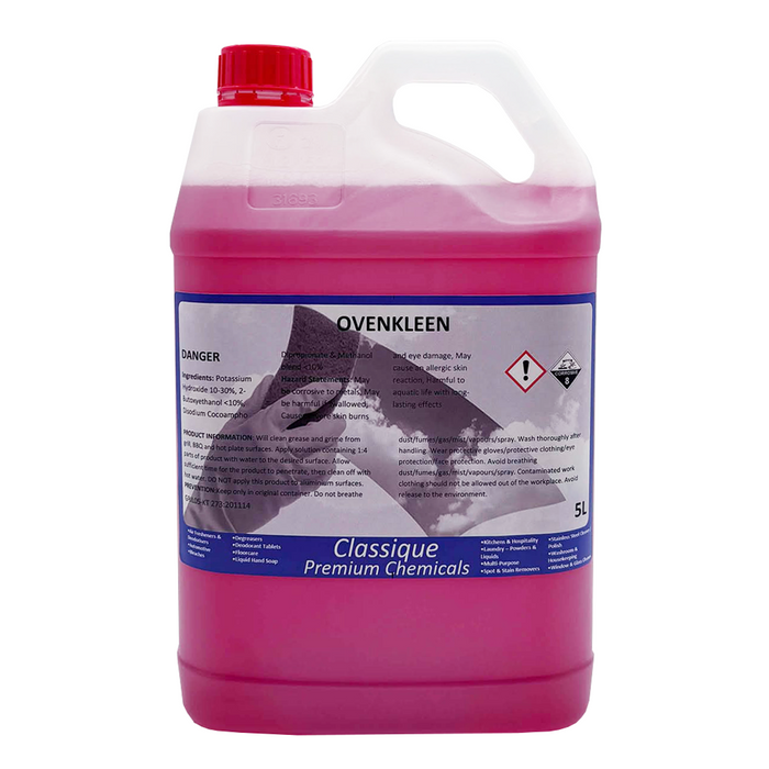 Ovenkleen 5L Oven & Grill Cleaner is a powerful, heavy-duty cleaner formulated to remove baked-on grease, fats, and food residues from ovens, grills, hotplates, and barbecue surfaces. Its fast-acting formula penetrates tough grime, cutting through layers of grease for an easy rinse and spotless finish. Ideal for commercial kitchens and food preparation areas, Ovenkleen helps maintain hygiene and performance in cooking equipment. Always use with care and appropriate protective gear.