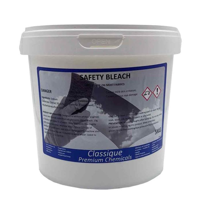 Safety Bleach Powder 5kg is a concentrated, chlorine-based cleaner ideal for disinfecting, whitening, and stain removal across a variety of surfaces. Suitable for use in laundry, washrooms, and general cleaning applications, it effectively eliminates germs and odours while brightening whites. Its powdered form offers easy handling, controlled dosing, and long shelf life, making it a reliable choice for commercial and industrial environments.