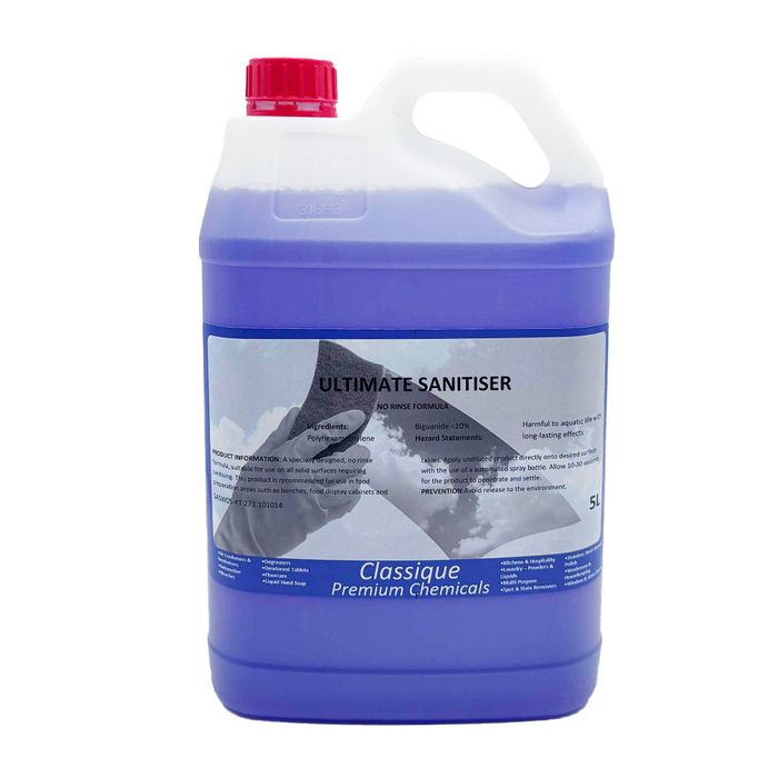 Ultimate Sanitiser FPA 5L is a food-grade surface sanitiser specifically formulated for use in food preparation areas, commercial kitchens, and food processing environments. This ready-to-use solution effectively kills a broad spectrum of bacteria without leaving harmful residues, ensuring hygienically clean surfaces that meet food safety standards. Ideal for benches, equipment, and utensils, it provides powerful sanitation while being safe for use around food.
