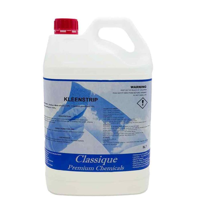 Kleenstrip Floor Stripper 5L is a fast-acting, ammoniated, water-based solution designed for the effective removal of cross-linked and metallised floor polishes. Its powerful formula penetrates and emulsifies stubborn polish films, making it ideal for deep stripping tasks in commercial and industrial settings. Suitable for use on various hard floor surfaces, it prepares floors for resealing or refinishing. Always follow safety guidelines and dilution instructions for optimal results.