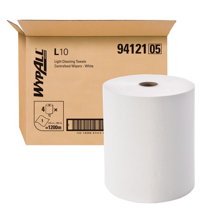 From wiping up grime, oil and grease to soaking up food prep spills, having the right wiper on hand is crucial to your operation. A clean and absorbent alternative to paper towels, rags and shop towels, WYPALL® offers a wide range of task-specific wipes and cloths designed to meet your industry, budget and absorbency needs.The WYPALL® L-range of single use wipers are designed for high frequency, light-duty, everyday tasks. Ideal for many workplace environments such as food service, hospitality and retail. Available in 1, 2 and 3-ply options This 300m, 1 ply wiper in white, provides value without compromising on quality, delivering the strength and absorbency you would expect from WYPALL® brand.Certified by HACCP International.Each wiper roll measures 18cm x 300m and is available in a case count of 4 rolls. It is compatible with KIMBERLY-CLARK PROFESSIONAL® Centrefeed dispenser (7087) in black ABS plastic. WYPALL® L10 Regular Duty Centrefeed Wiper Roll by KIMBERLY-CLARK PROFESSIONAL®, form part of a wider range of products designed to create a safer, healthier and more productive workplace.