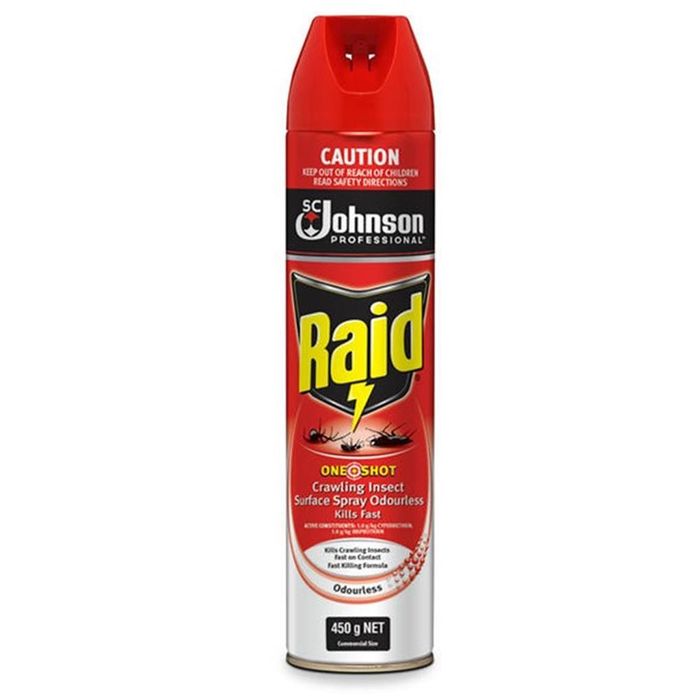 Raid® One Shot Crawling Insect Surface Spray Odourless â¯Kills Fast is a powerful, fast-acting insecticide designed to eliminate crawling insects on contact while leaving no lingering odour. Ideal for use in homes where scent sensitivity is a concern, this surface spray kills insects such as cockroaches, ants, and spiders instantly and continues to protect treated surfaces for up to 4 weeks. The advanced formula provides immediate knockdown with long-lasting residual action, offering reliable, low-odour pest control for ongoing peace of mind.
