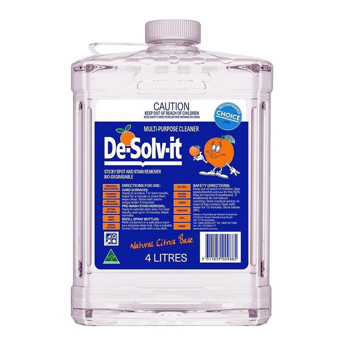 De-Solv-it is a highly effective, citrus-based solvent ideal for a wide range of cleaning, degreasing, dewaxing, stain-removal, and adhesive removal tasks. Unlike traditional hydrocarbon solvents, it is not classified as Class 3 Flammable, making it significantly safer to use. The natural citrus base ensures a pleasant scent without overwhelming vapours, and it can be easily rinsed off with warm, soapy water. Proudly Australian-made, De-Solv-it offers a powerful and safe solution for various cleaning needs, combining effectiveness with user safety.