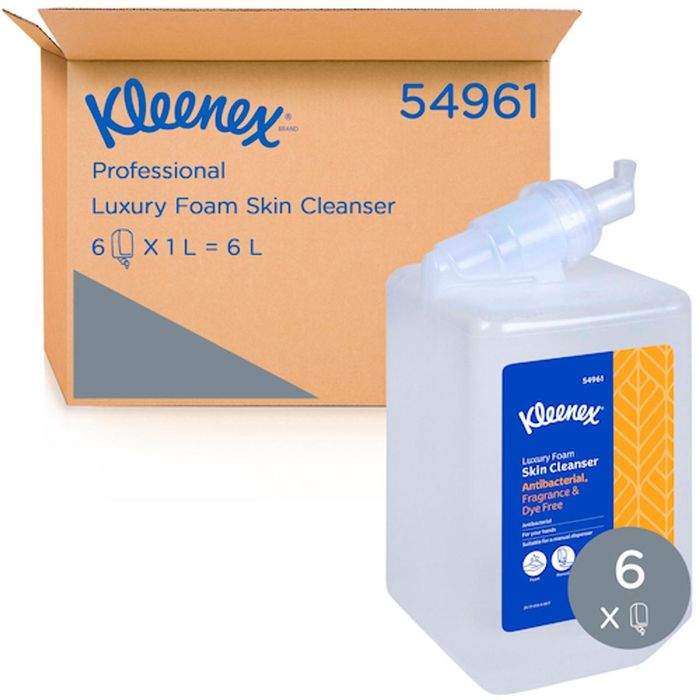 Uplift your washroom experience with the trusted and familiar KLEENEX® Brand, designed to deliver an unrivalled experience while supporting high workplace hygiene standards. The everyday formula of KLEENEX® Luxury Foam Hand Soap effectively cleans your skin and is certified by HACCP International. KLEENEX® Luxury Foam Antibacterial Hand Soap is dispensed as a foam delivering a luxurious feel for the user. This luxurious foaming soap is free from fragrances and dyes and is suitable for frequent hand washing. Each case of KLEENEX® Luxury Foam Hand Soap consists of 2 foam soap refill cartridges. KLEENEX® brand skincare cartridges are individually sealed and provide up to 2,500 applications per 1L foam cartridge* (*for foam cartridge with 1L capacity). Compatible with both AQUARIUS® Skin Care Dispenser (69480) in white ABS plastic and KIMBERLY-CLARK PROFESSIONAL® Skin Care Dispenser (6341) in stainless steel. Each case of KLEENEX® Luxury Foam Antibacterial Hand Soap contains six individual refill cartridges. Each refill cartridge contains 1L of foam hand soap. KLEENEX® Luxury Foam Antibacterial Hand Soap by KIMBERLY-CLARK PROFESSIONAL®, forms part of a wide range of washroom products designed to create a safer, healthier and more productive workplace.