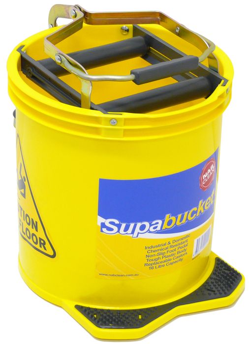 Yellow Clean Mop Bucket, a heavy-duty 16-litre plastic bucket built for robust cleaning and maintenance tasks. Designed with superior strength, it features non-slip foot pedals and castors that ensure safe and easy wringing, allowing for controlled wet or dry mopping applications. Ideal for efficient and effective cleaning in various environments, this bucket combines durability with ease of use for enhanced productivity.