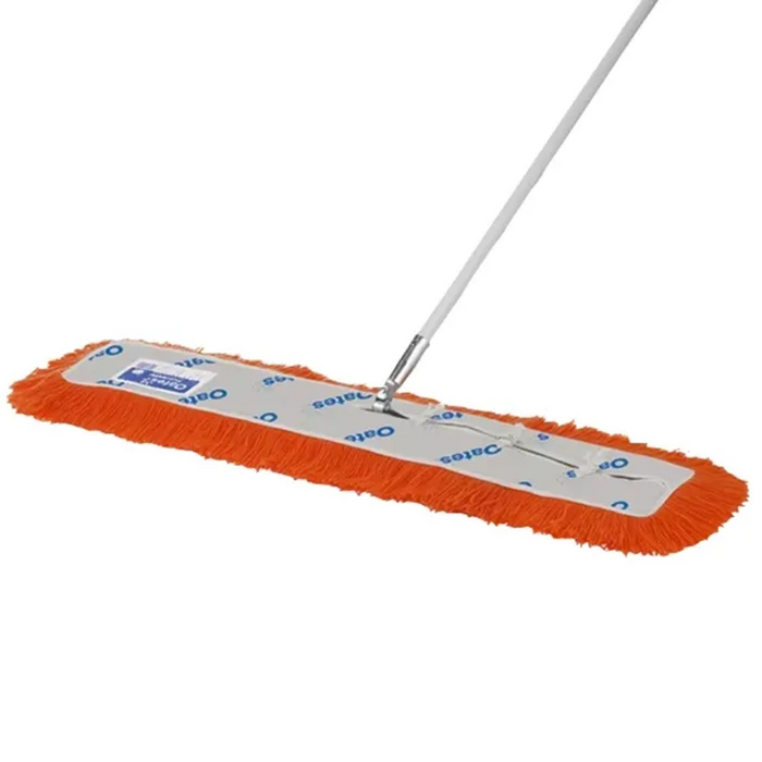 Dust Control Mop Complete 91cm with Orange Modacrylic fibres. This mop features a sturdy metal frame that swivels into hard-to-reach places, ensuring thorough cleaning. The highly resilient and durable modacrylic fibres effectively capture dirt, lint, and dust. Equipped with a 25mm powder-coated steel handle, this mop offers both durability and comfort, making it ideal for both residential and commercial use.