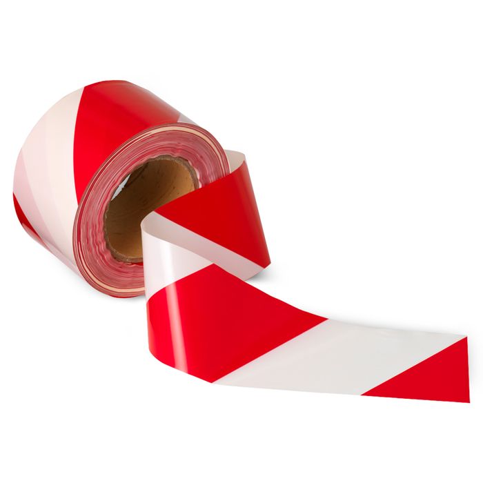 Barrier Tape with Red/White Stripes, designed for effective demarcation and safety. Featuring bold red and white stripes, each roll measures 100 meters in length and 75 mm in width, providing durable and visible marking for various applications. This tough barrier tape ensures clear delineation and is ideal for use in construction sites, events, and other areas where safety and visibility are paramount.