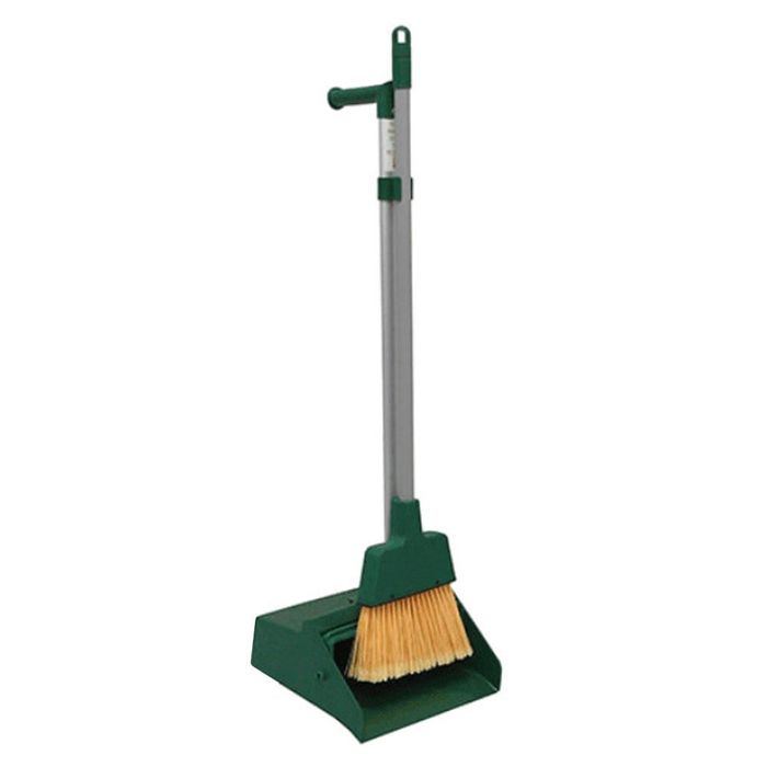 Lobby Pan & Broom Set in Green Plastic with L-Grip, designed for efficient cleaning in lobby and public areas. This set features a sturdy blue plastic lobby pan with an ergonomic L-shaped grip for comfortable handling, paired with a matching broom equipped with industrial-strength flagged bristles for thorough cleaning. Each set includes a separate clip for easy adjustments or replacements, ensuring durability and longevity. Sold in cartons of 6 sets, this cleaning tool is ideal for tackling large cleaning jobs while maintaining cleanliness in various environments.