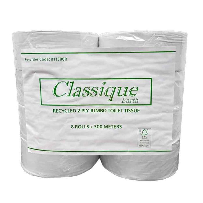 Promote sustainability in your high-traffic restrooms with Classique Recycled 2 Ply Jumbo Toilet Tissue. Each carton contains 8 jumbo rolls, each 300 meters long, made from 100% recycled materials. This eco-friendly toilet tissue offers excellent strength and softness, ensuring a comfortable and efficient clean. Ideal for commercial use, the jumbo rolls reduce the frequency of replacements, providing both environmental and economic benefits. Choose Classique Recycled Jumbo Toilet Tissue for reliable, sustainable performance.
