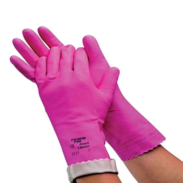 Ansell Premium Pink Gloves are FDA compliant and made from neoprene for added chemical resistance. The cotton flock lining absorbs perspiration for enhanced comfort. These gloves feature natural latex for high tensile strength and are wax-coated for better water repellency. The silver lining facilitates easy donning and doffing, while the pebble sandpatch pattern ensures a firm grip on wet or dry objects. They are recommended for chemical handling and janitorial use.