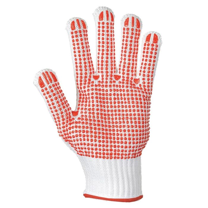 Polka Dot Ladies Single-Sided Gloves are white knitted polycotton wrist gloves with black PVC dots on one side, designed to keep fingerprints off surfaces. They are washable and feature a 7-gauge knit for strength and ventilation, bleached for a clean appearance. The PVC dots provide extra grip. Sold by the pair, these gloves are available in cartons of 240.