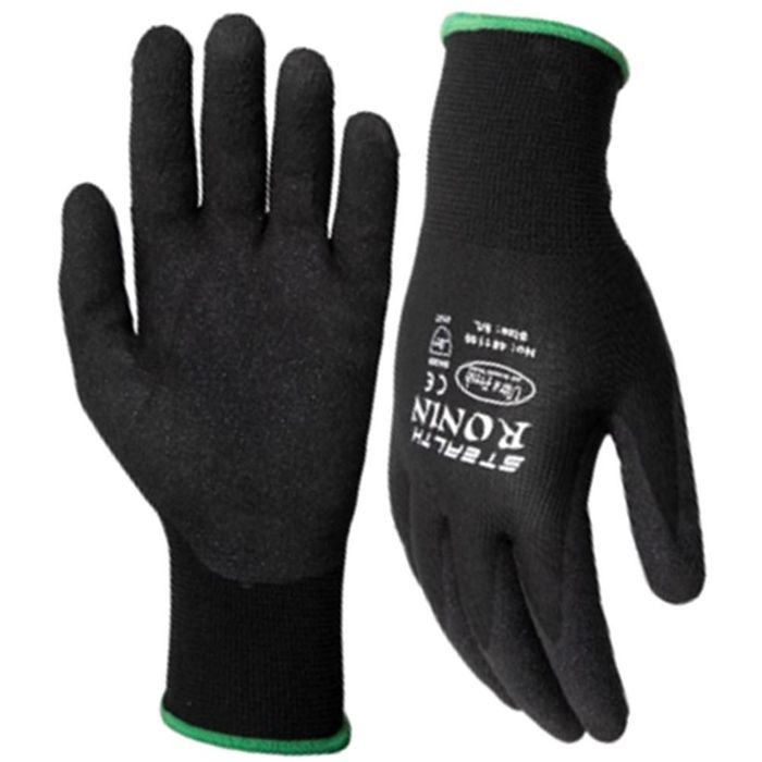 Ronin Black Nylon Glove, a seamless 15 gauge black nylon shell glove designed for optimal performance in various tasks. These gloves provide excellent grip and feature very high abrasion and tear resistance due to their superior material composition. The nitrile foam coating ensures exceptional grip, while the flexible and durable design makes them ideal for general-purpose use. A knitted cuff ensures a secure fit with optimal comfort and good tactile feel. Perfect for the automotive industry, packaging, general purposes, engineering, and maintenance tasks, these gloves are sold per pair or available in cartons of 120 pairs.