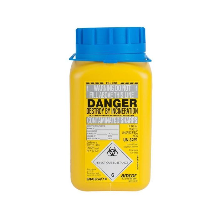 Sharps Container 1.58L is designed for the safe collection and disposal of used sharps, such as needles and syringes, in medical and clinical settings. Featuring a bright yellow, easily identifiable case with a blue top, this self-contained unit ensures clear visibility and secure containment. With dimensions of 210mm x 104mm, it offers a maximum capacity of 1.58L and a recommended fill line at 1.27L for safe handling and disposal. Ideal for hospitals, clinics, and first aid environments.