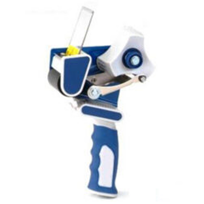Pistol Grip Tape Dispenser in blue is a heavy-duty premium dispenser that reduces noise while dispensing tape. It is suitable for tapes with a maximum width of 50mm and all 75mm cores, providing a sturdy and efficient solution for sealing boxes and packages.