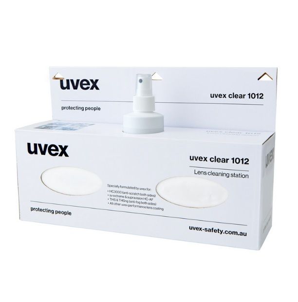 Uvex Disposable Lens Cleaning Station, designed to ensure a clear view at all times. This practical and convenient cleaning station is perfect for keeping your safety glasses clean and is easily wall-mountable. It features highly absorbent, non-abrasive, and low-lint tissues, providing effective cleaning without scratching. The station offers easy access to both tissues and cleaning fluid, making maintenance quick and efficient. Ideal for both wall mounting and countertop use, the Uvex Disposable Lens Cleaning Station is a must-have for any workspace focused on safety and clarity.